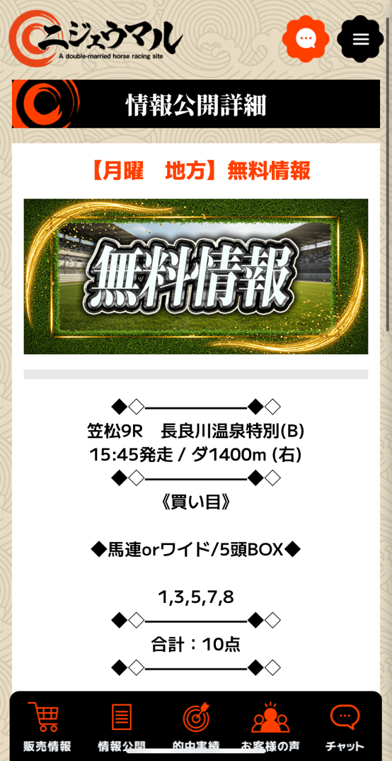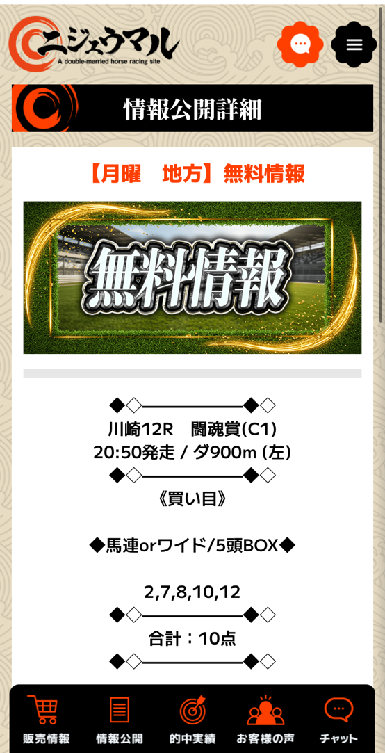 地方競馬が生活の生計を立てています(笑) その理由がニジュウマルというサイトに出会い使用スタートしたからです。 つい先日も金沢の重賞、北国王冠で最下位人気を的中させて1690.4倍の特大10万馬券的中しました。 1万円以下の馬券代で50万7120円払戻し、派遣の仕事で月に20万ちょいしか稼げないから競馬の的中がないと生活できない、今回も給料日前に助かりました。